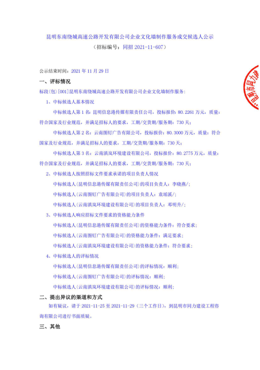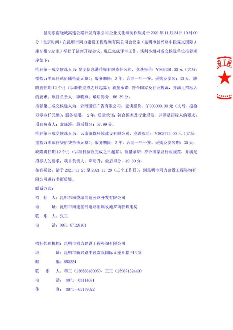 昆明东南绕城高速公路开发有限公司企业文化墙制作服务成交候选人公示