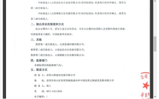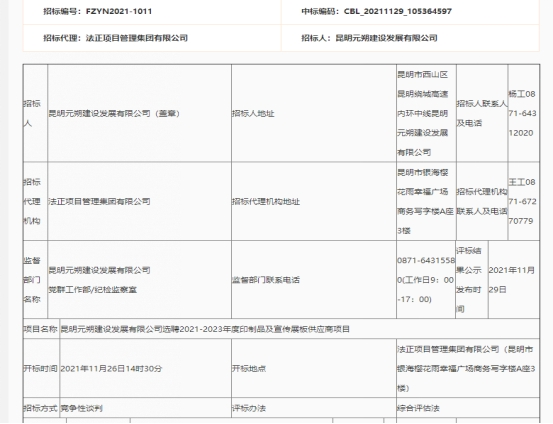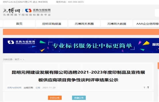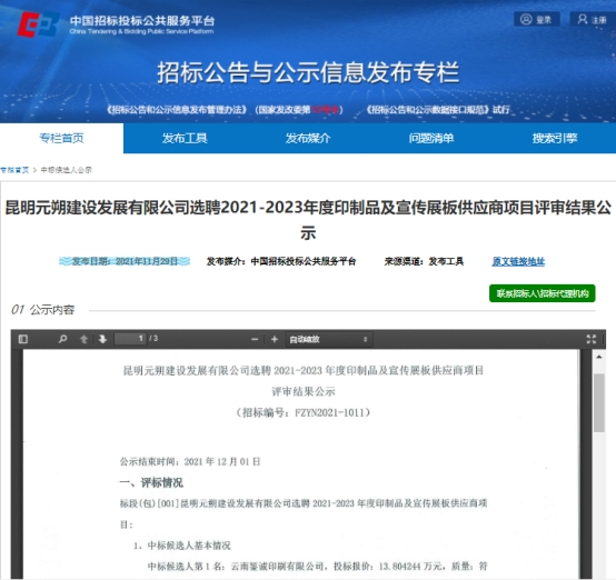 昆明元朔建设发展有限公司选聘2021-2023年度印制品及宣传展板供应商项目评审结果公示