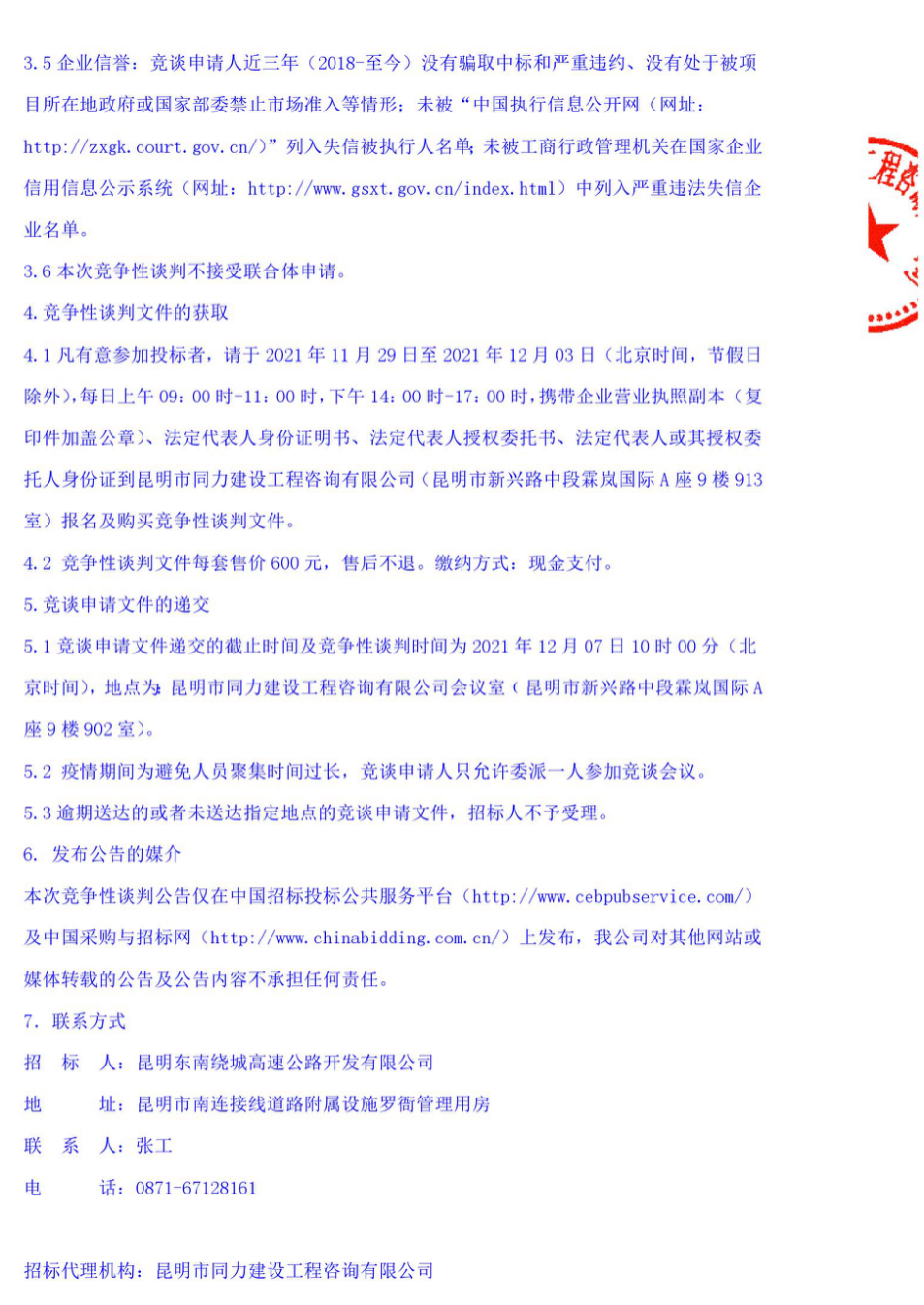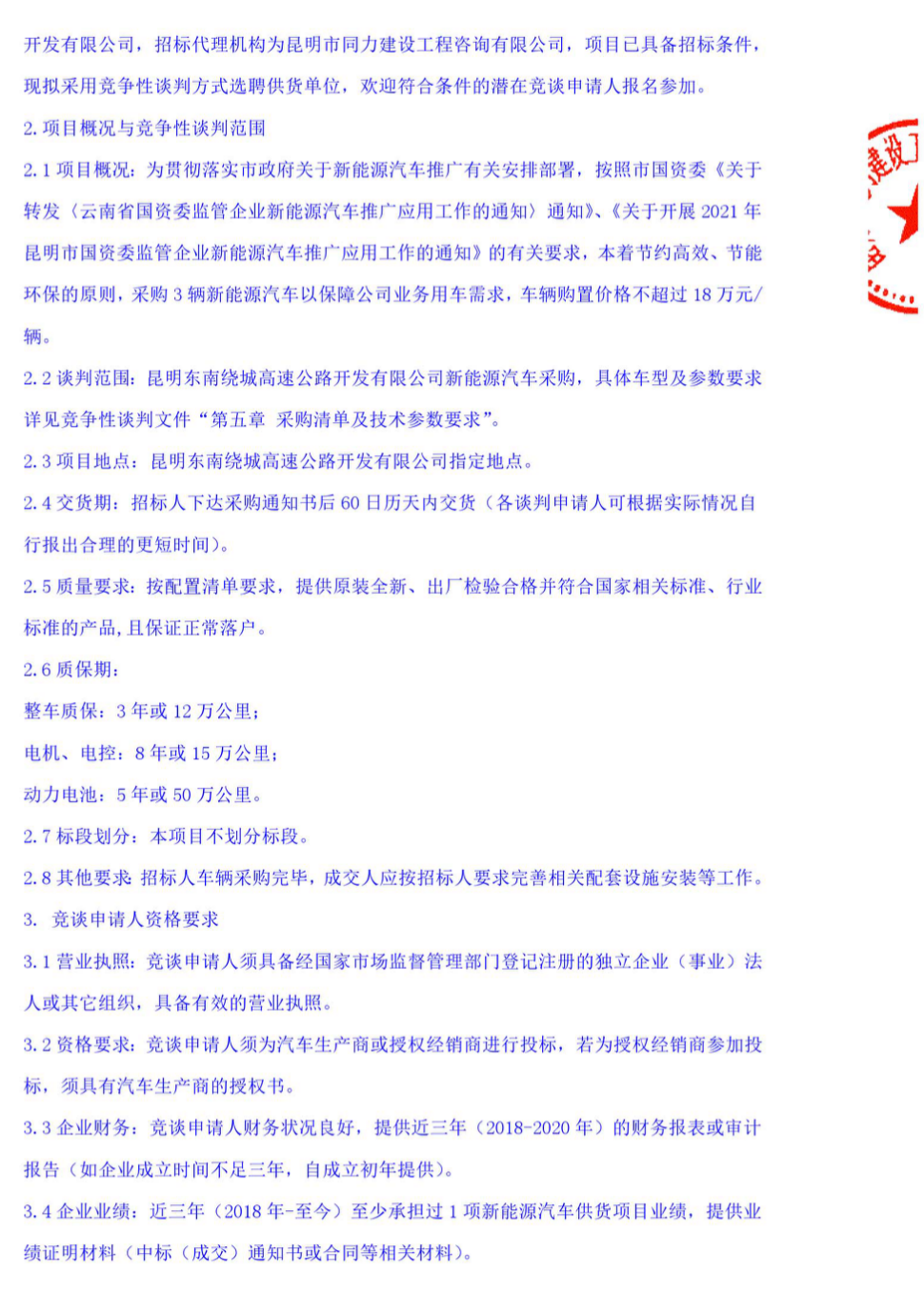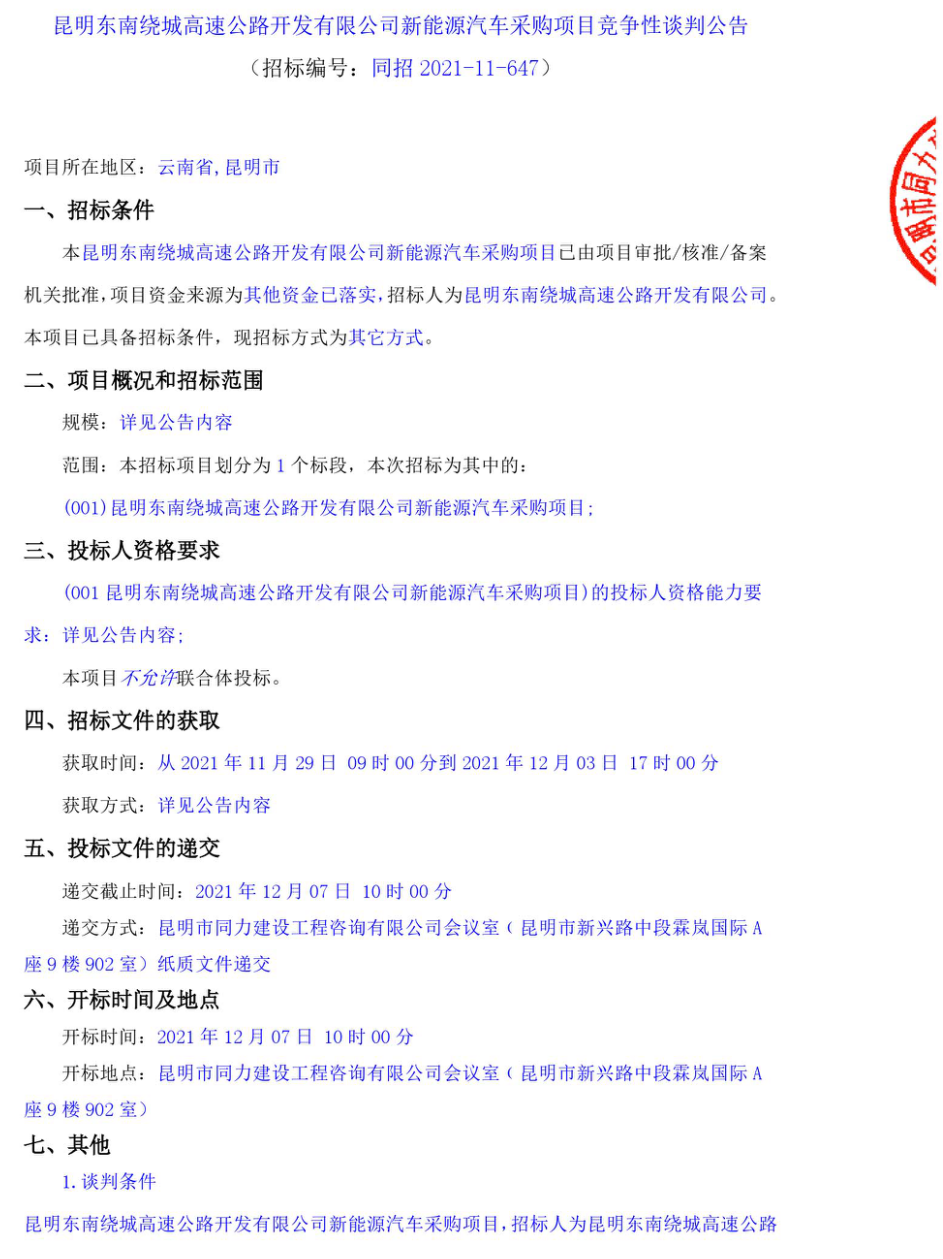 昆明东南绕城高速公路开发有限公司新能源汽车采购项目竞争性谈判公告