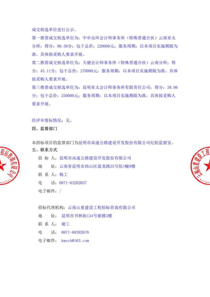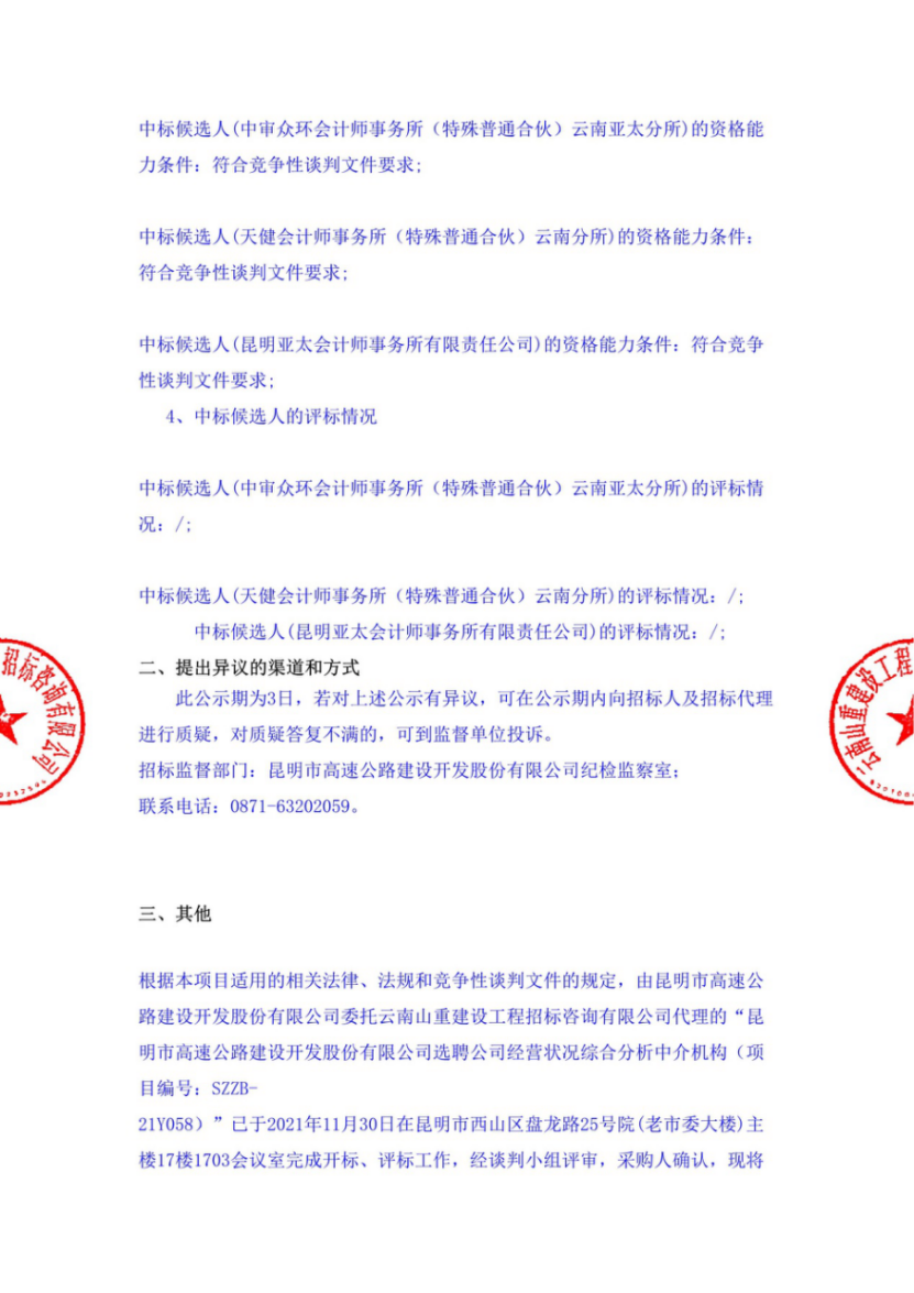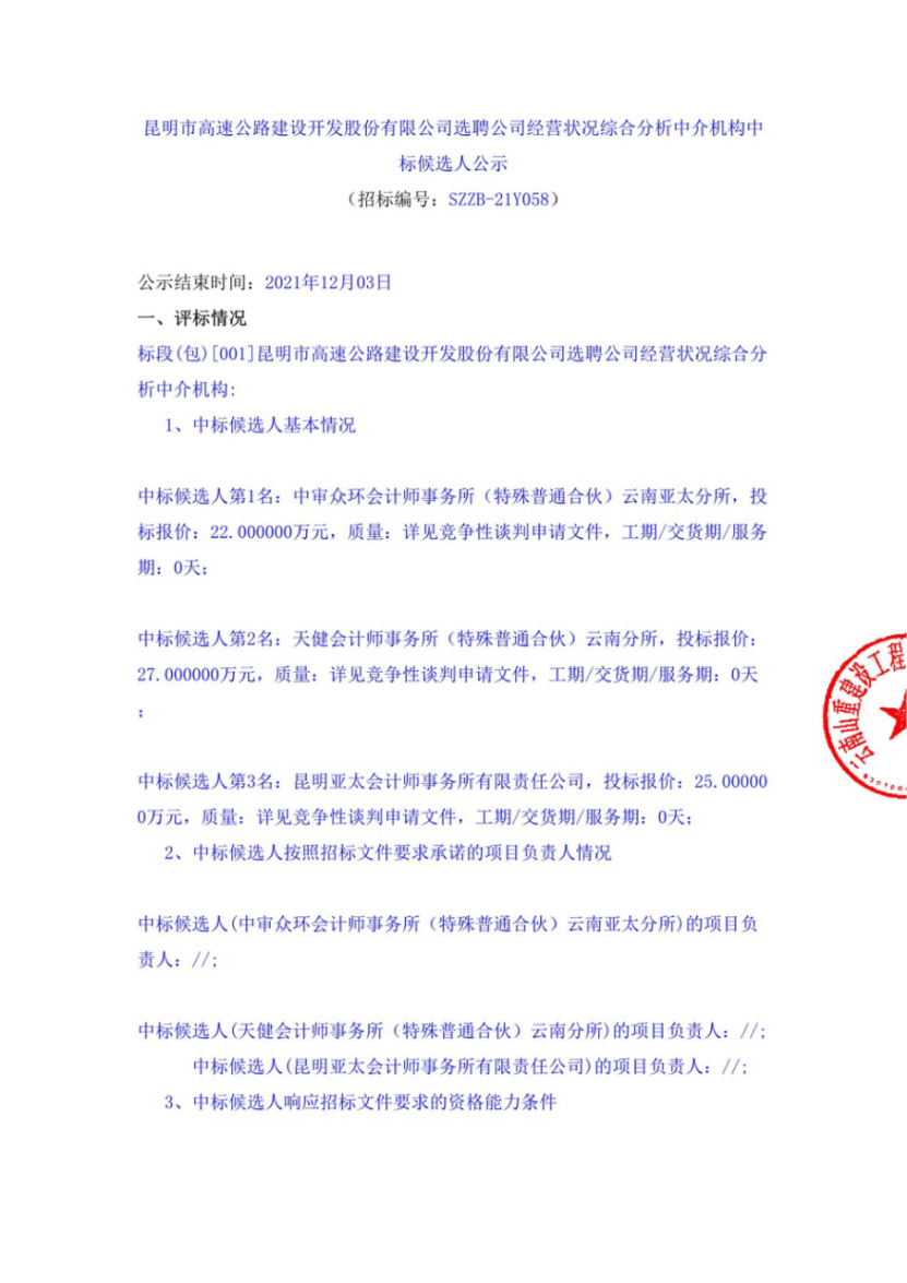 昆明市高速公路建设开发股份有限公司选聘公司经营状况综合分析中介机构中标候选人公示