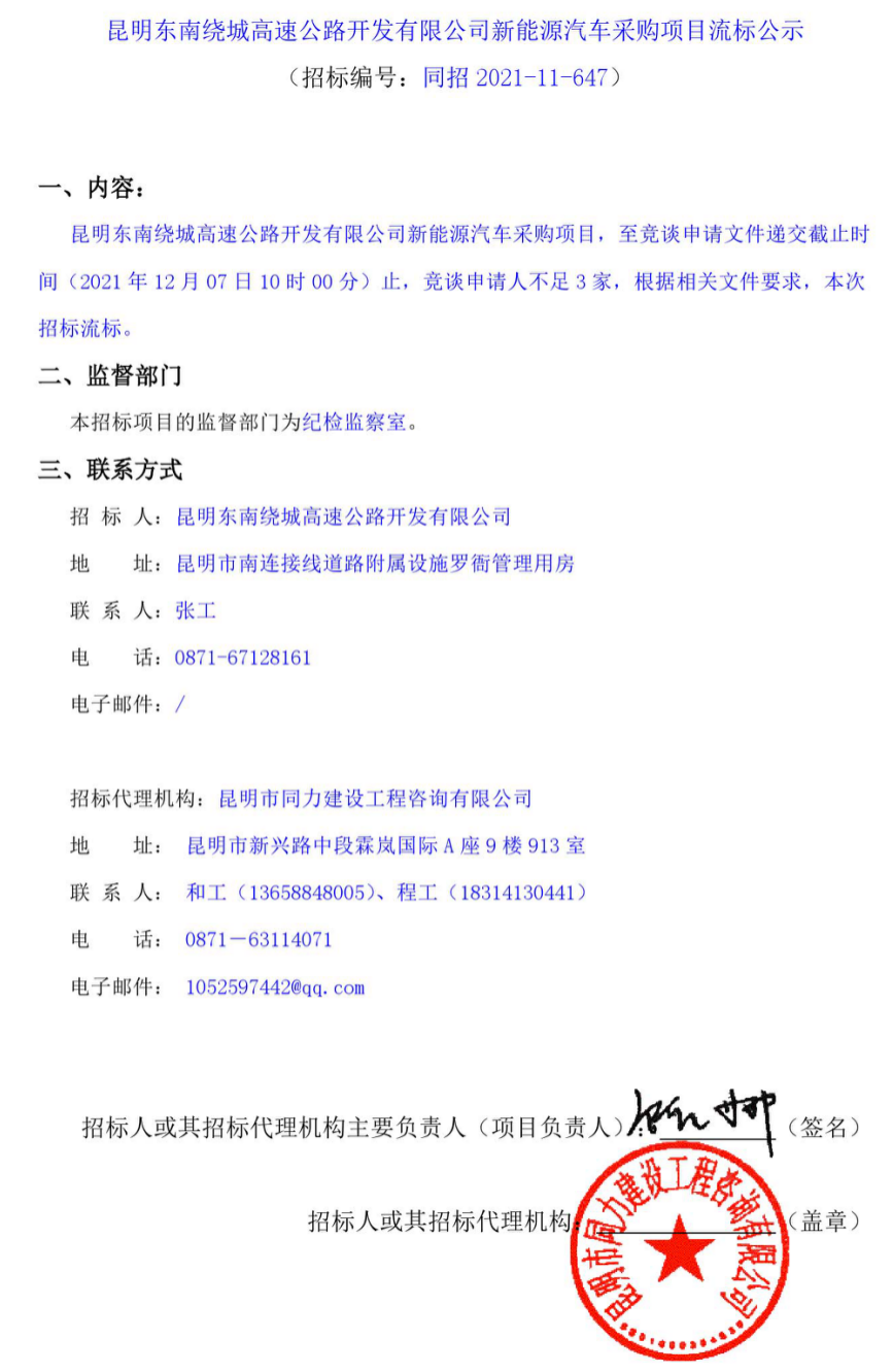 昆明东南绕城高速公路开发有限公司新能源汽车采购项目流标公示