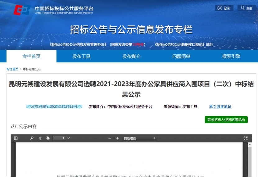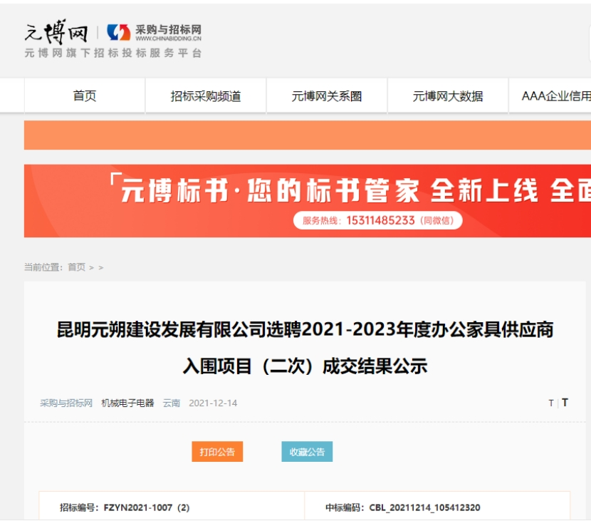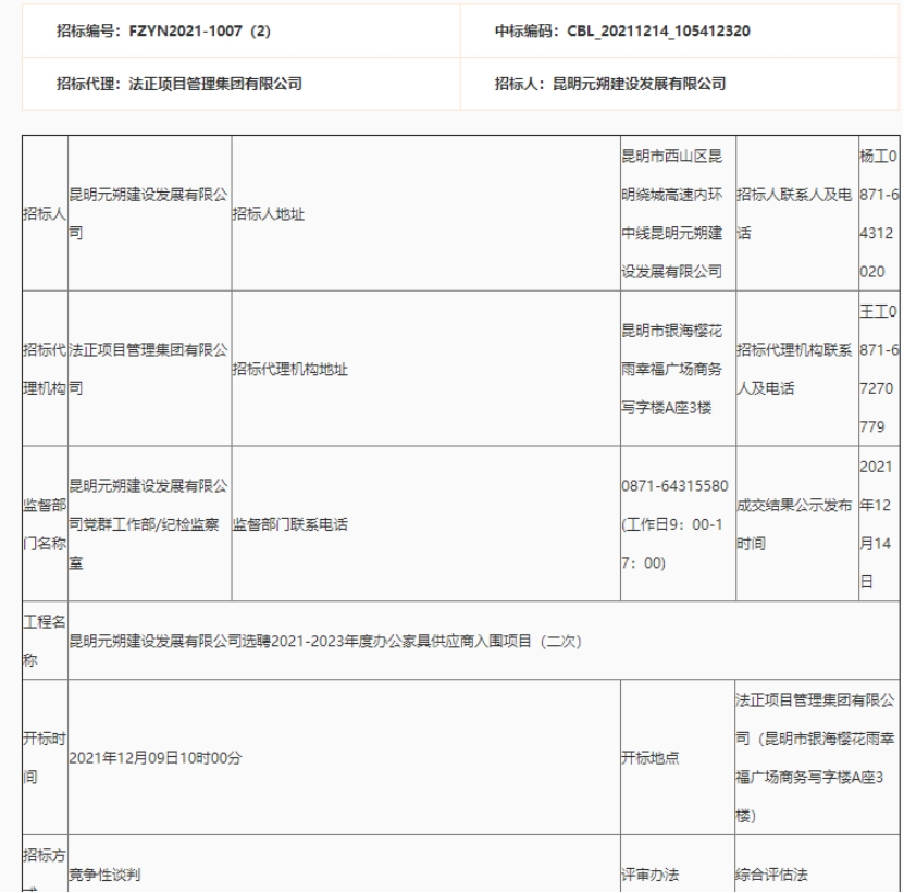 昆明元朔建设发展有限公司选聘2021-2023年度办公家具供应商入围项目(二次)成交结果公示发布信息