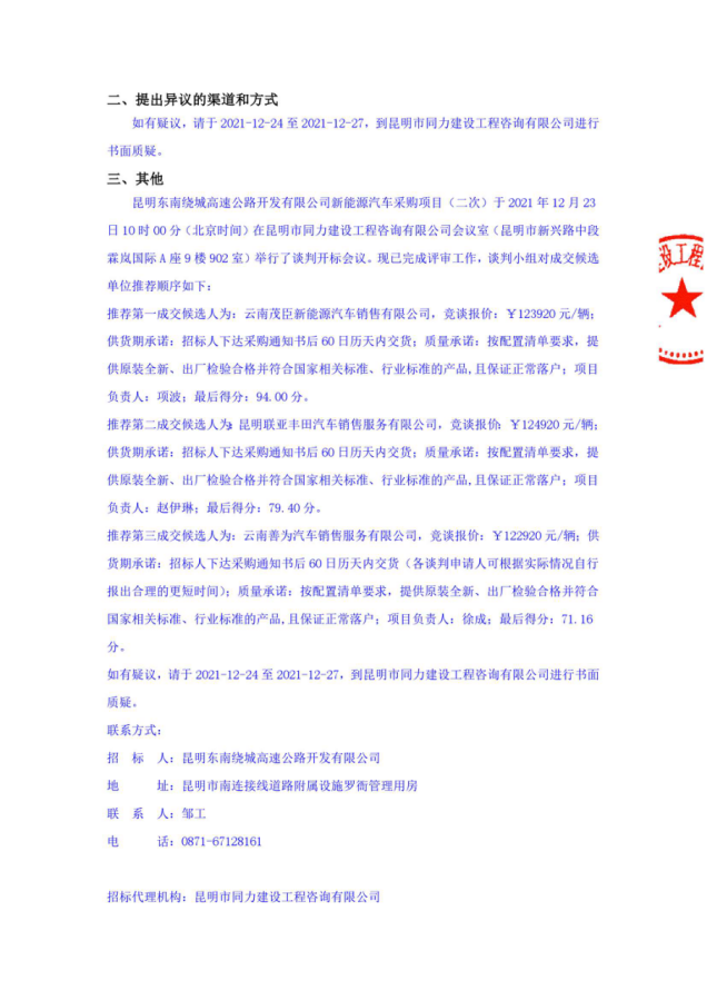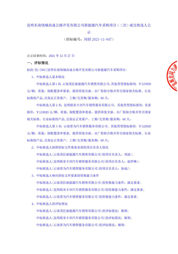 昆明东南绕城高速公路开发有限公司新能源汽车采购项目(二次)成交候选人公示