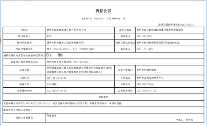 昆明绕城高速公路东南段食堂服务及管理用房保洁服务流标公示