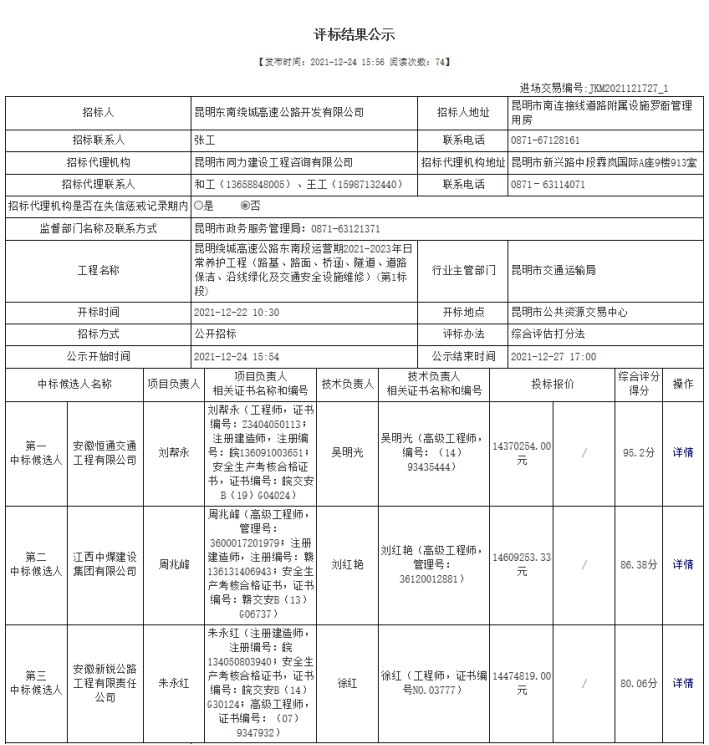 昆明绕城高速公路东南段运营期2021-2023年日常养护工程(路基、路面、桥涵、隧道、道路保洁、沿线绿化及交通安全设施维修)第1标段评标结果公示