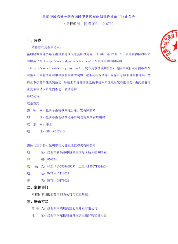 昆明绕城高速公路东南段服务区充电基础设施施工终止公告