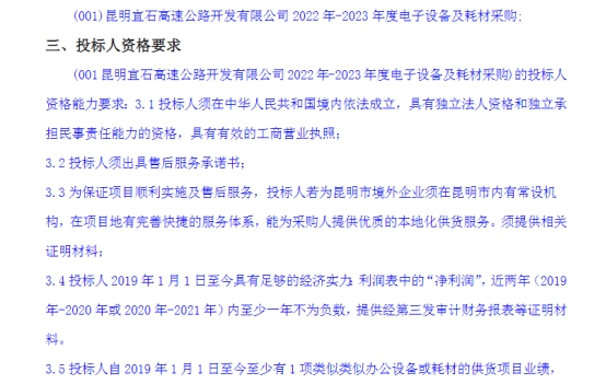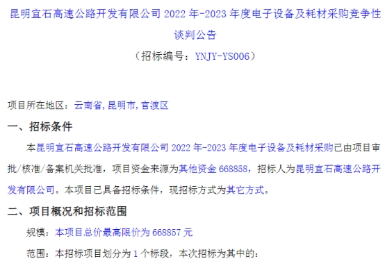 昆明宜石高速公路开发有限公司2022年-2023年度电子设备及耗材采购竞争性谈判公告