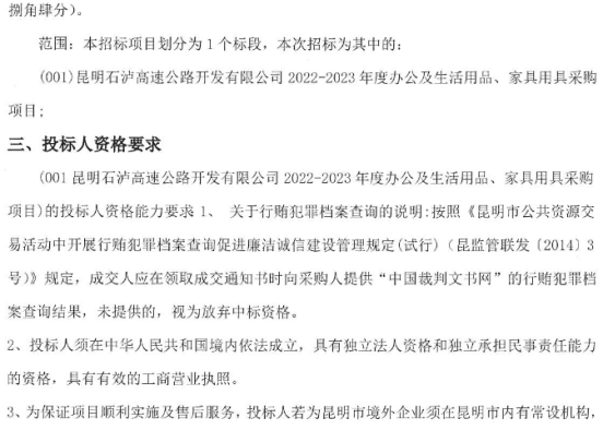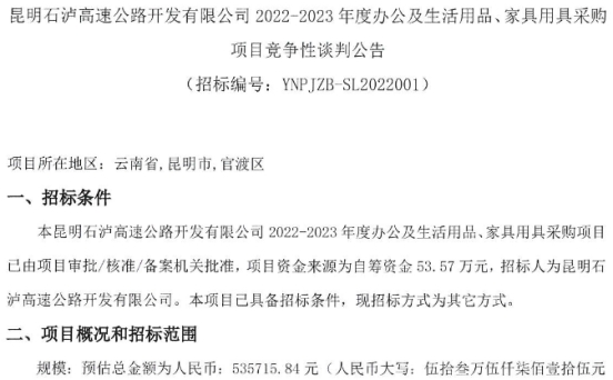 昆明石泸高速公路开发有限公司2022-2023年度办公及生活用品、家具用具采购竞争性谈判公告