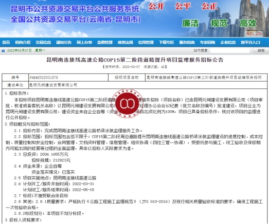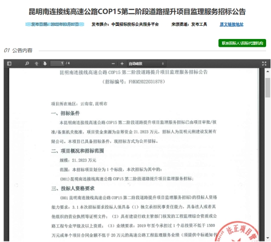 昆明南连接线高速公路COP15第二阶段道路提升项目监理服务招标公告