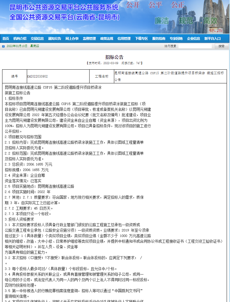昆明南连接线高速公路COP15第二阶段道路提升项目桥梁涂装施工招标公告【中国招标投标公共服务平台,点击可查看】