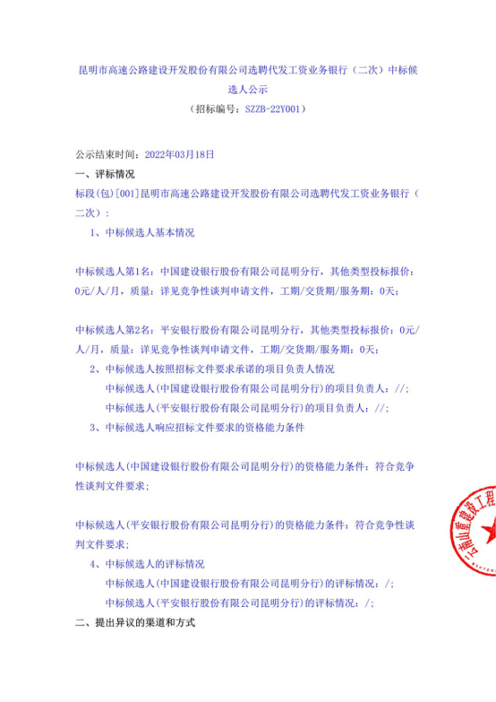 昆明市高速公路建设开发股份有限公司选聘代发工资业务银行(二次)中标候选人公示
