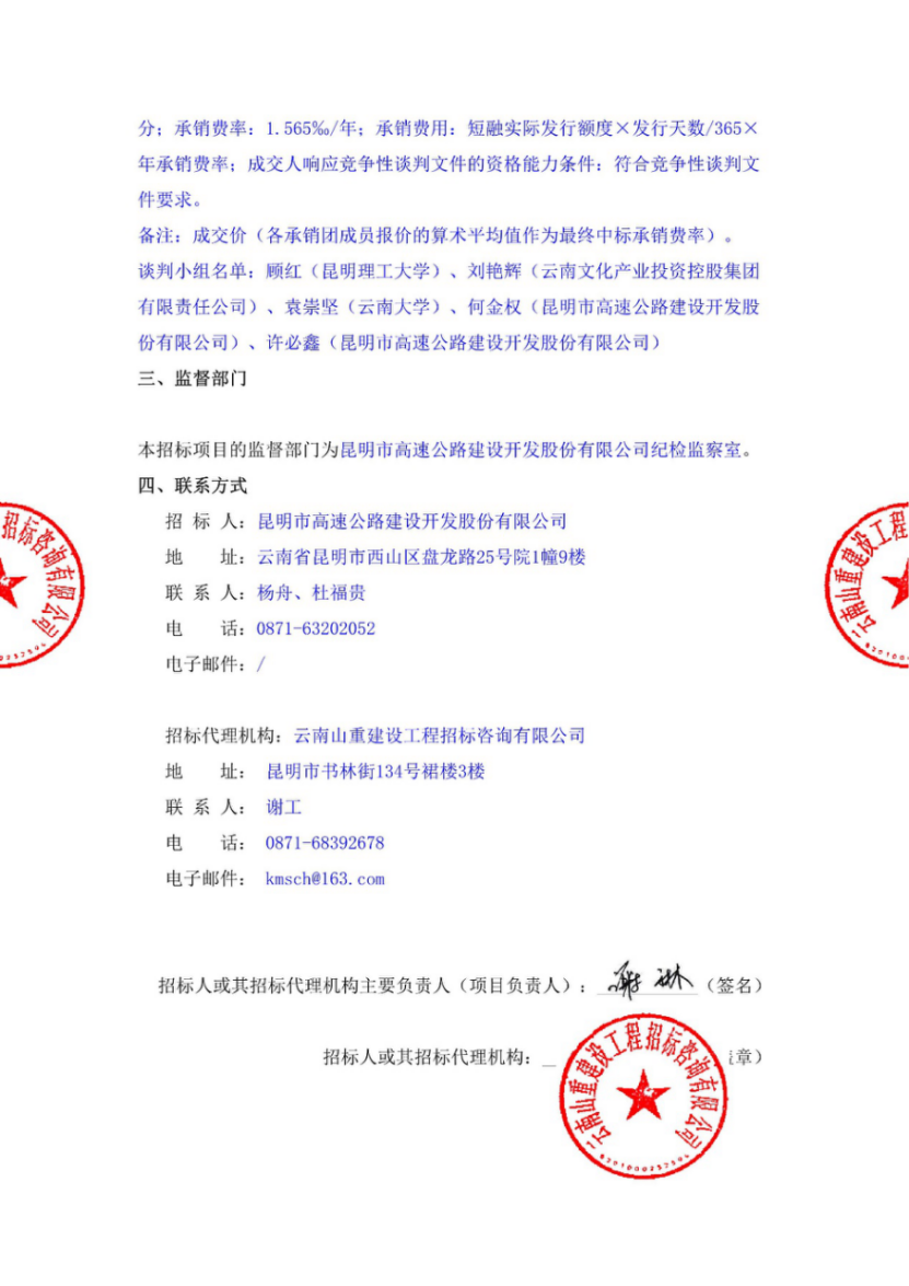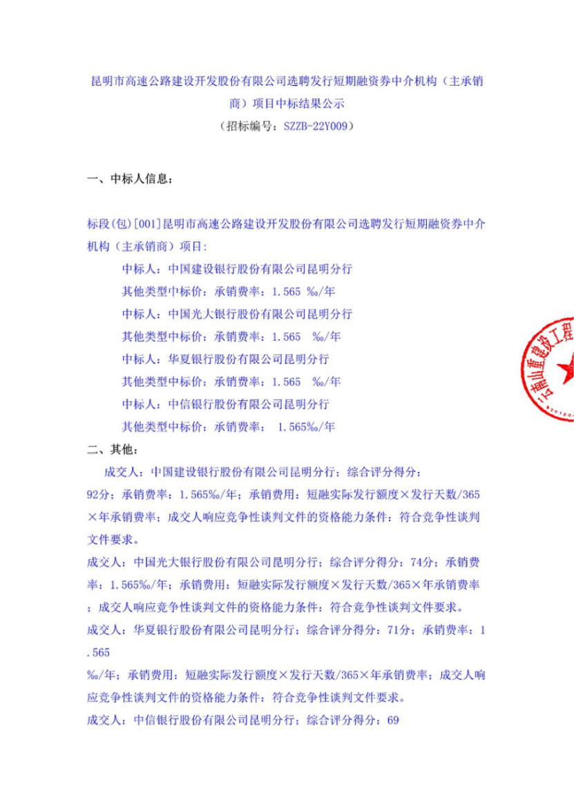 昆明市高速公路建设开发股份有限公司选聘发行短期融资券中介机构(主承销商)项目中标结果公示