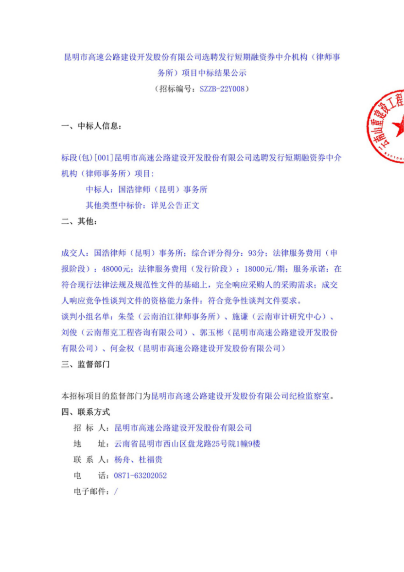 昆明市高速公路建设开发股份有限公司选聘发行短期融资券中介机构(律师事务所)项目中标结果公示