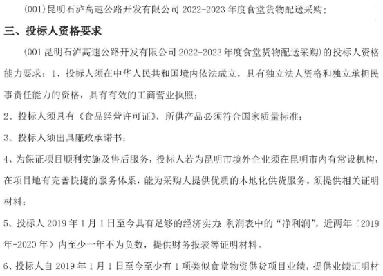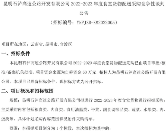 昆明石泸高速公路开发有限公司 2022-2023年度食堂货物配送采购竞争性谈判公告