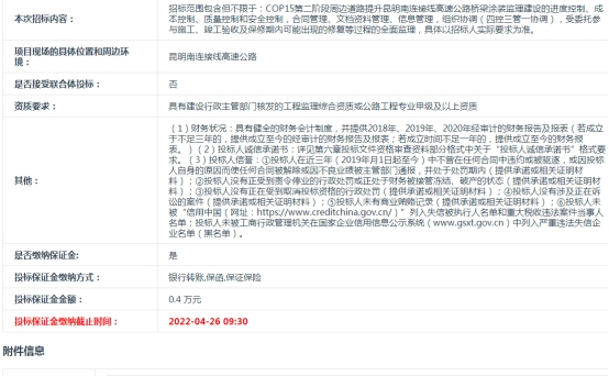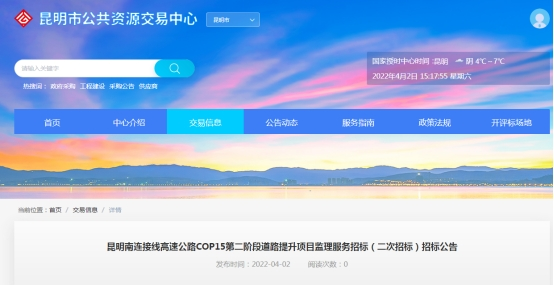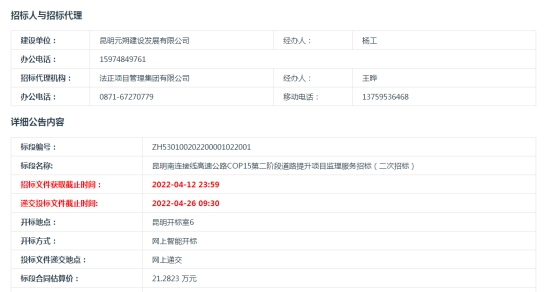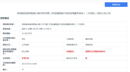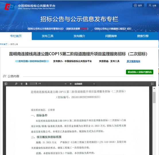 昆明南连接线高速公路COP15第二阶段道路提升项目监理服务招标项目(二次招标)