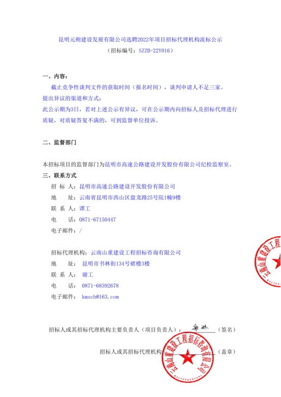 昆明元朔建设发展有限公司选聘2022年项目招标代理机构流标公示