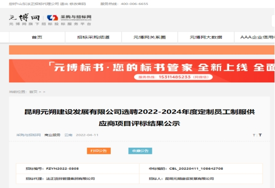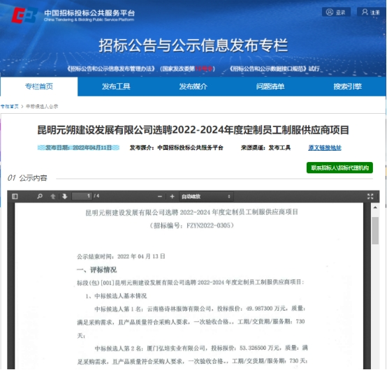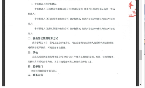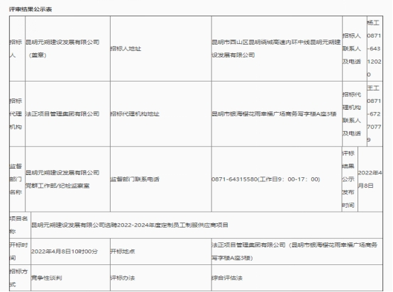 昆明元朔建设发展有限公司选聘2022-2024年度定制员工制服供应商项目评标结果公示