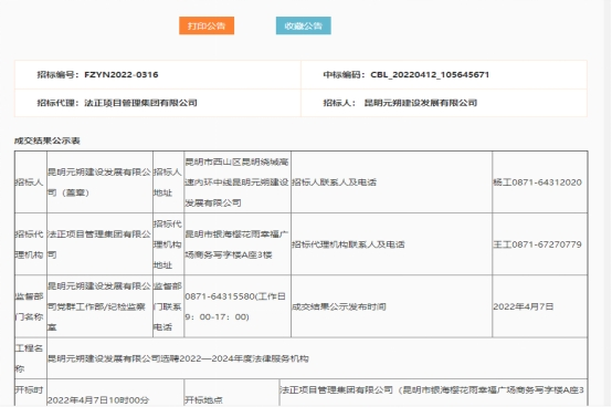 昆明元朔建设发展有限公司选聘2022-2024年度法律服务机构中标结果公示