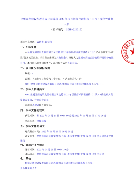 昆明元朔建设发展有限公司选聘2022年项目招标代理机构(二次)竞争性谈判公告