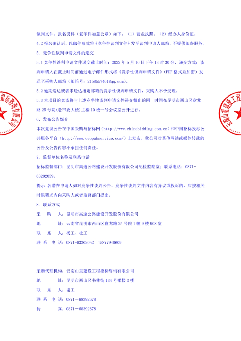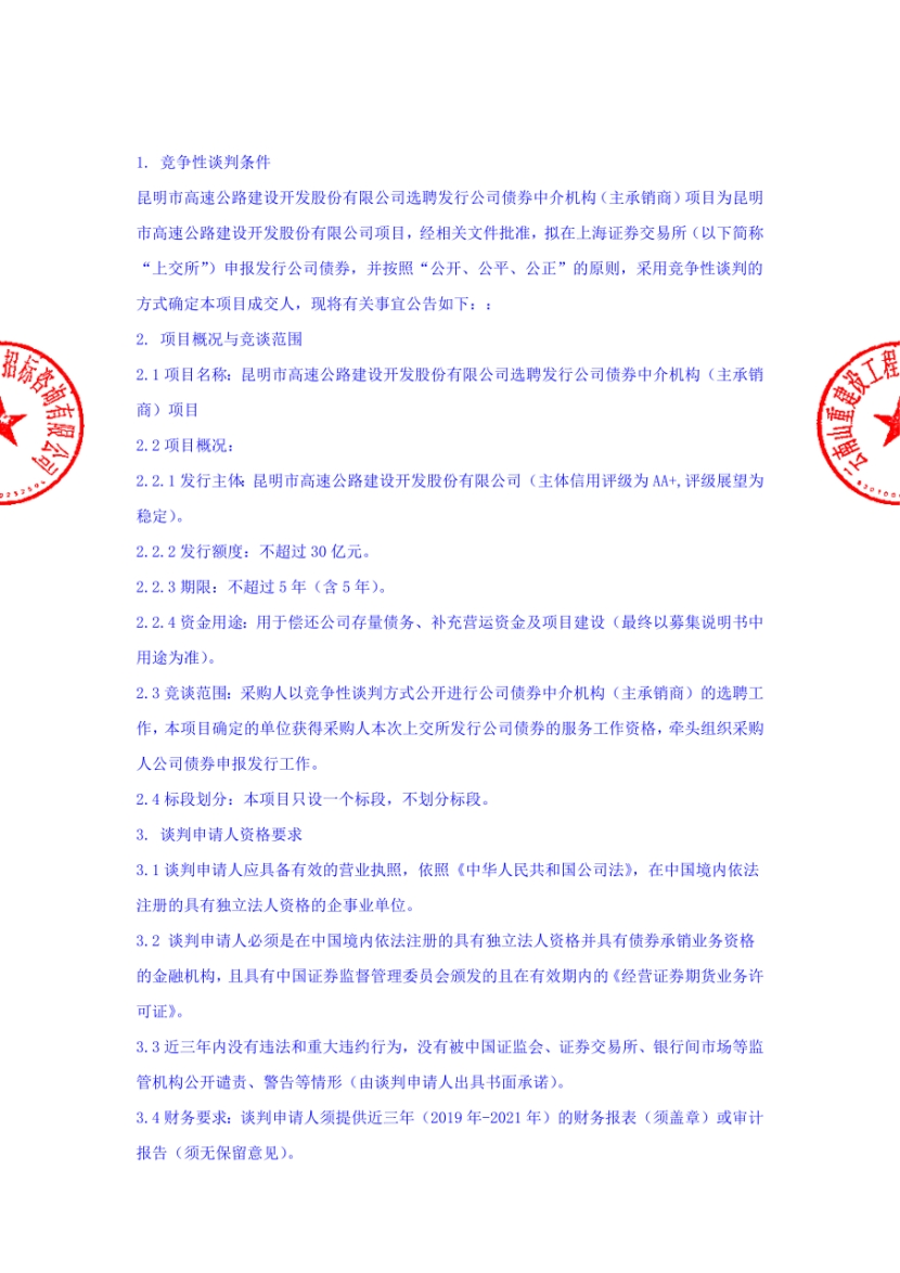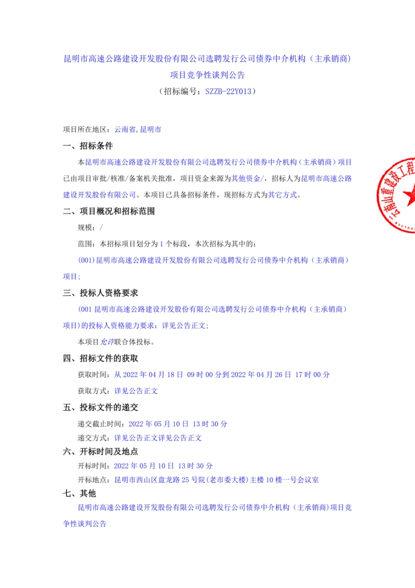 昆明市高速公路建设开发股份有限公司选聘发行公司债券中介机构(主承销商)项目竞争性谈判公告(2022年)
