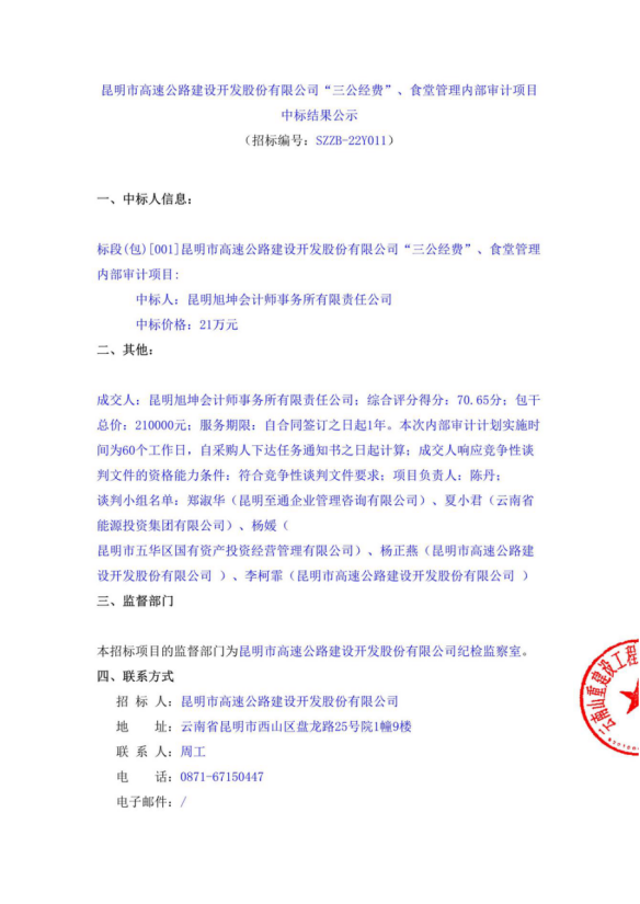 昆明市高速公路建设开发股份有限公司“三公经费”、食堂管理内部审计项目中标结果公示