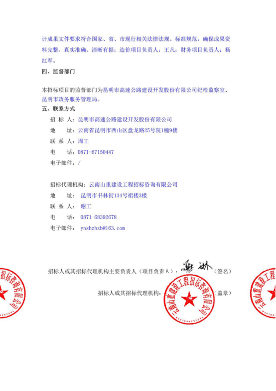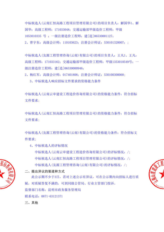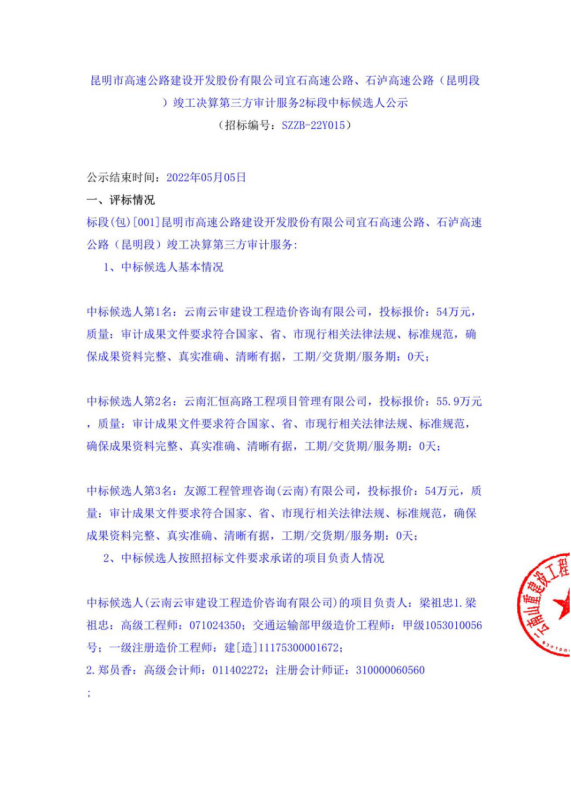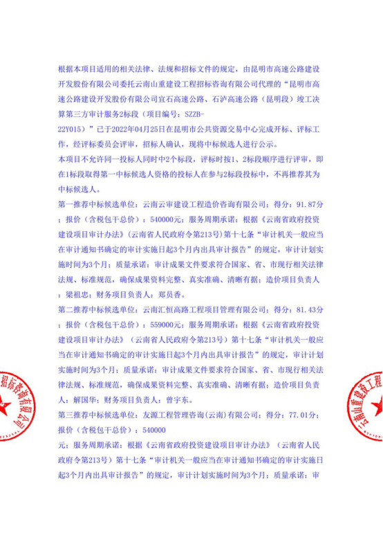 昆明市高速公路建设开发股份有限公司宜石高速公路、石泸高速公路(昆明段)竣工决算第三方审计服务2标段中标候选人公示