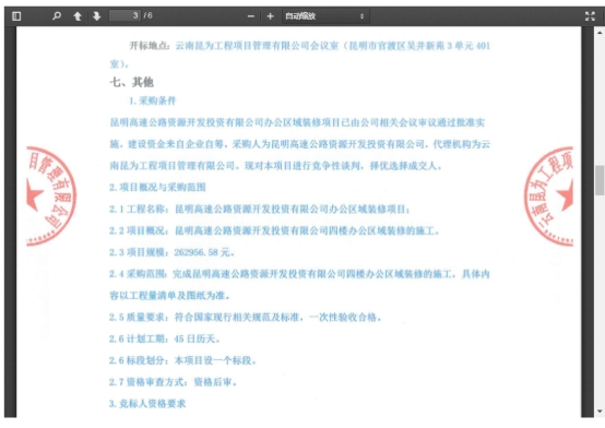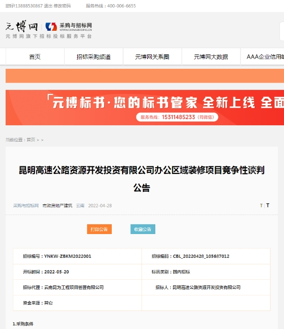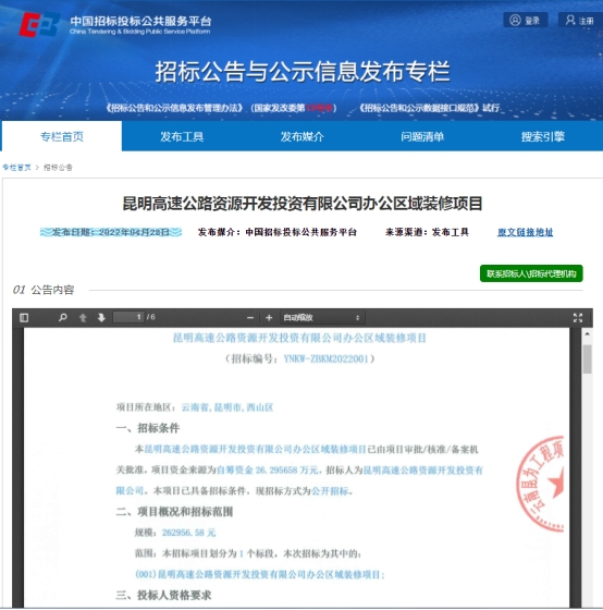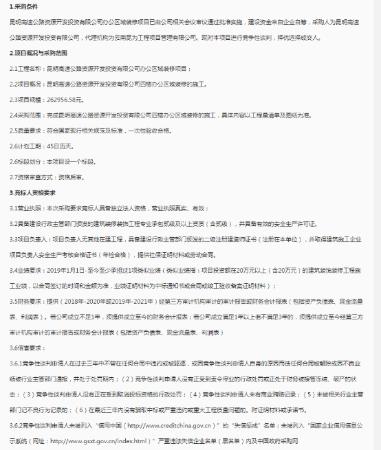 昆明高速公路资源开发投资有限公司办公区域装修项目竞争性谈判公告