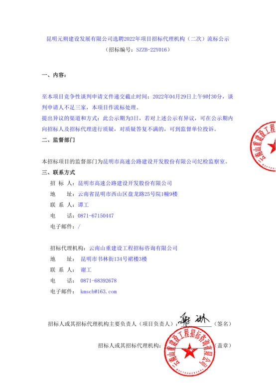 昆明元朔建设发展有限公司选聘2022年项目招标代理机构(二次)流标公示