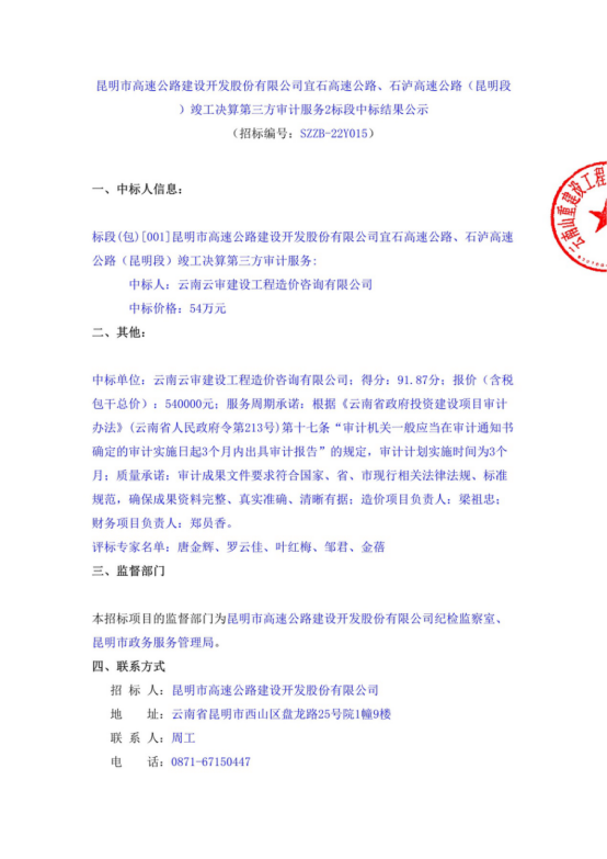 昆明市高速公路建设开发股份有限公司宜石高速公路、石泸高速公路(昆明段)竣工决算第三方审计服务2标段中标结果公示