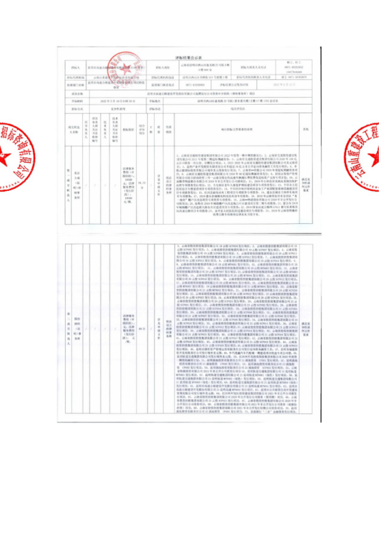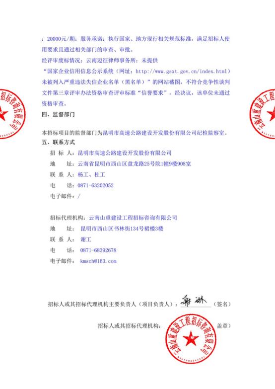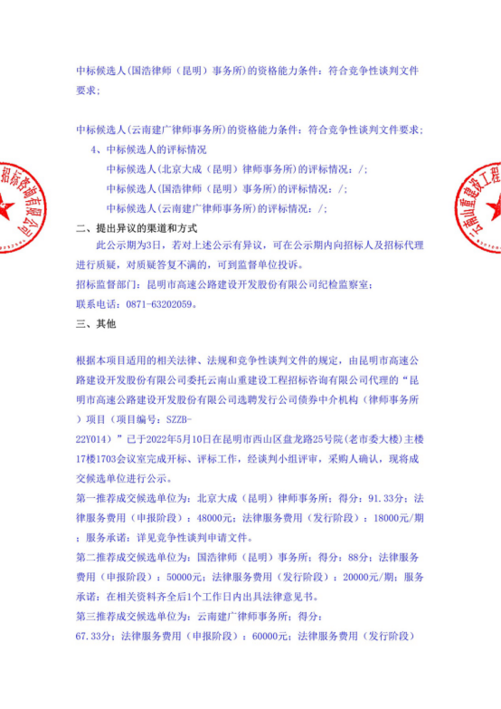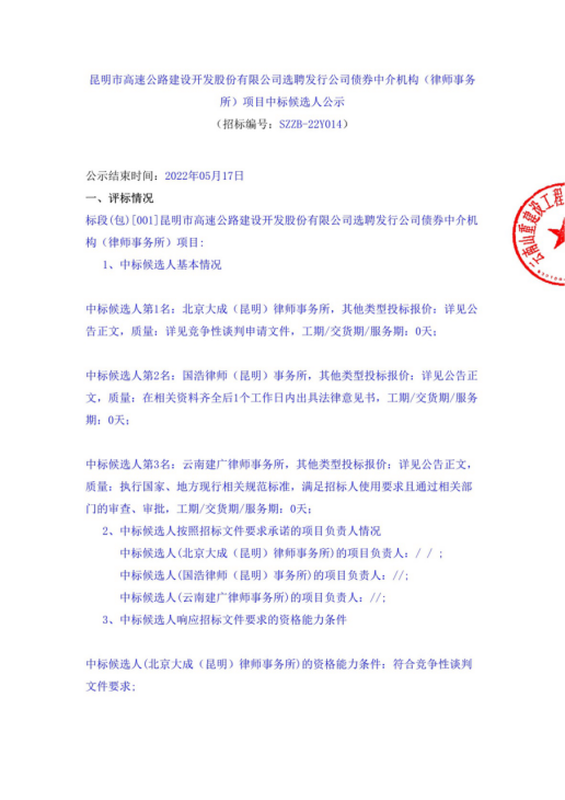 昆明市高速公路建设开发股份有限公司选聘发行公司债券中介机构(律师事务所)项目中标候选人公示