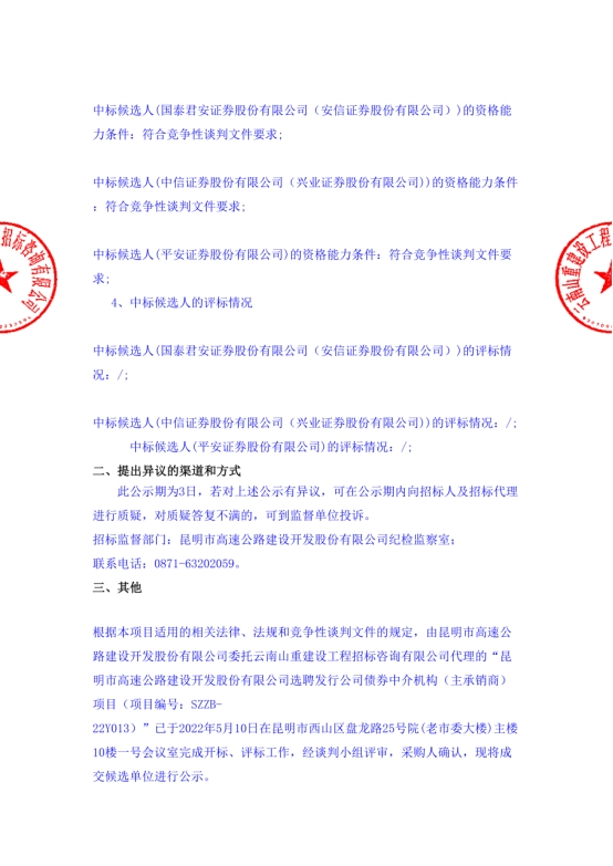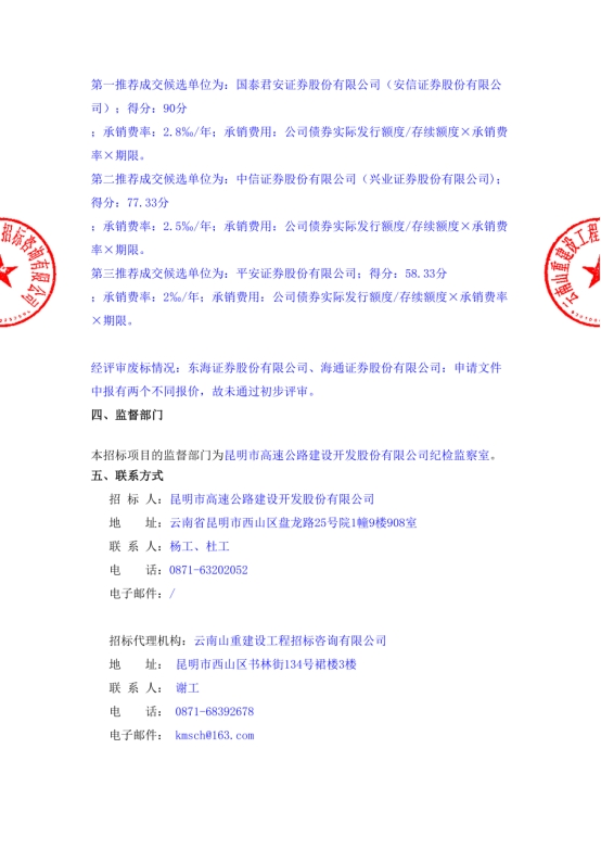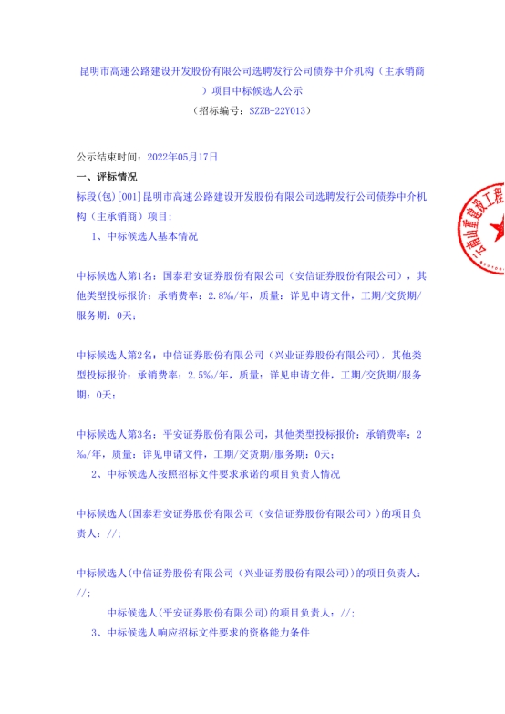 昆明市高速公路建设开发股份有限公司选聘发行公司债券中介机构(主承销商)项目中标候选人公示
