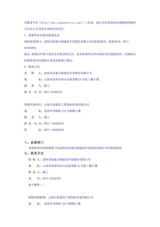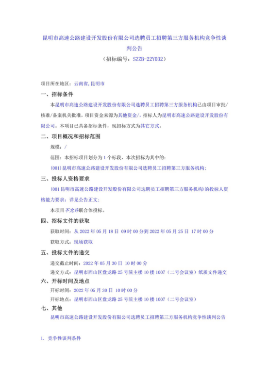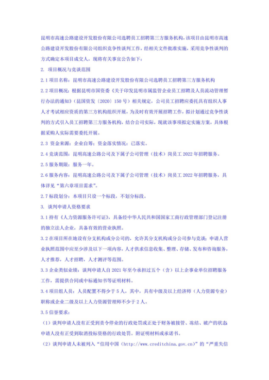 昆明市高速公路建设开发股份有限公司选聘员工招聘第三方服务机构竞争性谈判公告