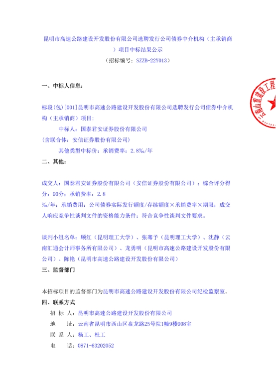 昆明市高速公路建设开发股份有限公司选聘发行公司债券中介机构(主承销商)项目中标结果公示