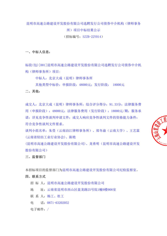 昆明市高速公路建设开发股份有限公司选聘发行公司 债券中介机构(律师事务所)项目中标结果公示