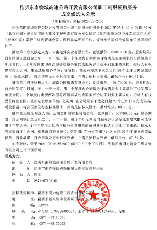 昆明东南绕城高速公路开发有限公司职工制服采购服务成交候选人公示