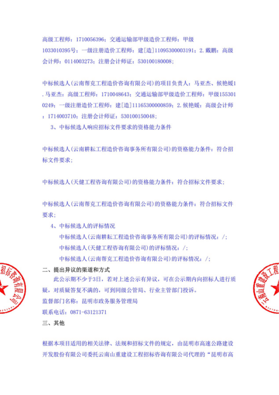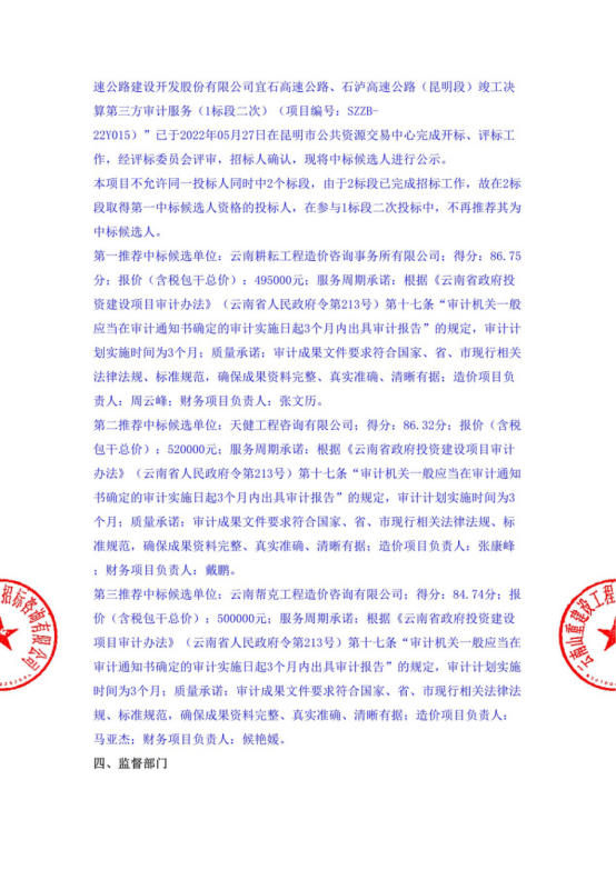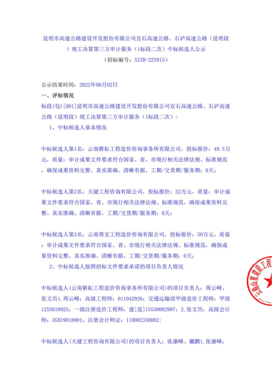 昆明市高速公路建设开发股份有限公司宜石高速公路、石泸高速公路(昆明段)竣工决算第三方审计服务(1标段二次)中标候选人公示