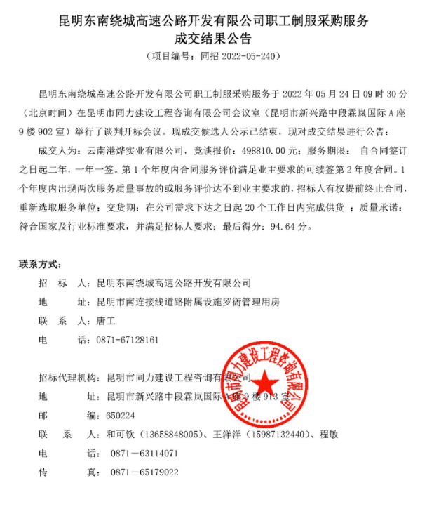 昆明东南绕城高速公路开发有限公司职工制服采购服务成交结果公告