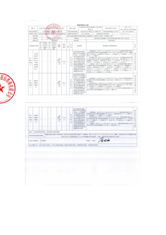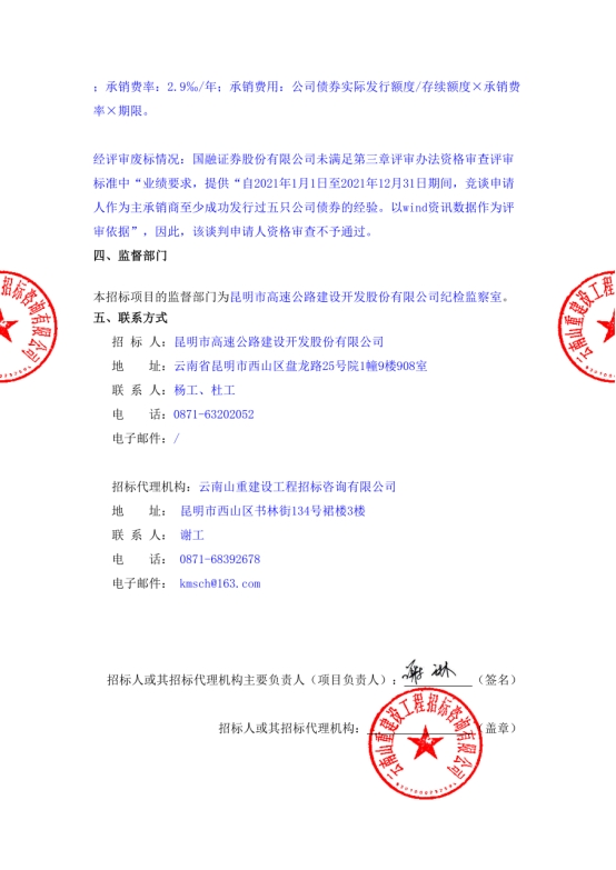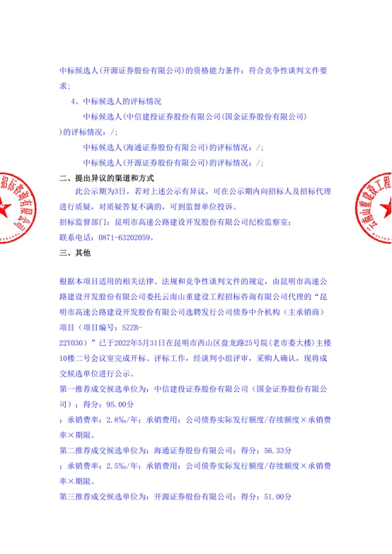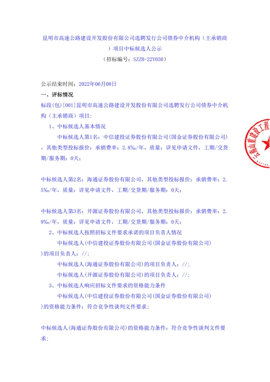 昆明市高速公路建设开发股份有限公司选聘发行公司债券中介机构(主承销商)中标候选人公示