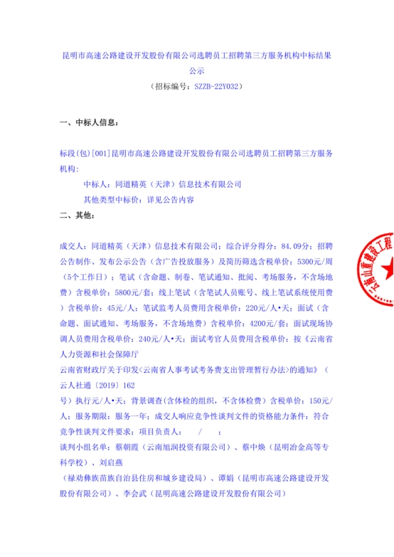 昆明市高速公路建设开发股份有限公司选聘员工招聘第三方服务机构中标结果公示