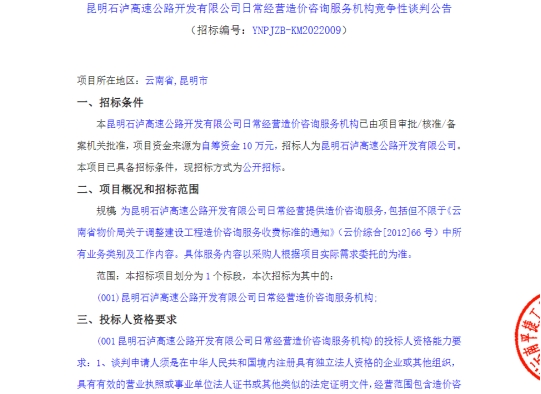昆明石泸高速公路开发有限公司日常经营造价咨询服务机构竞争性谈判公告