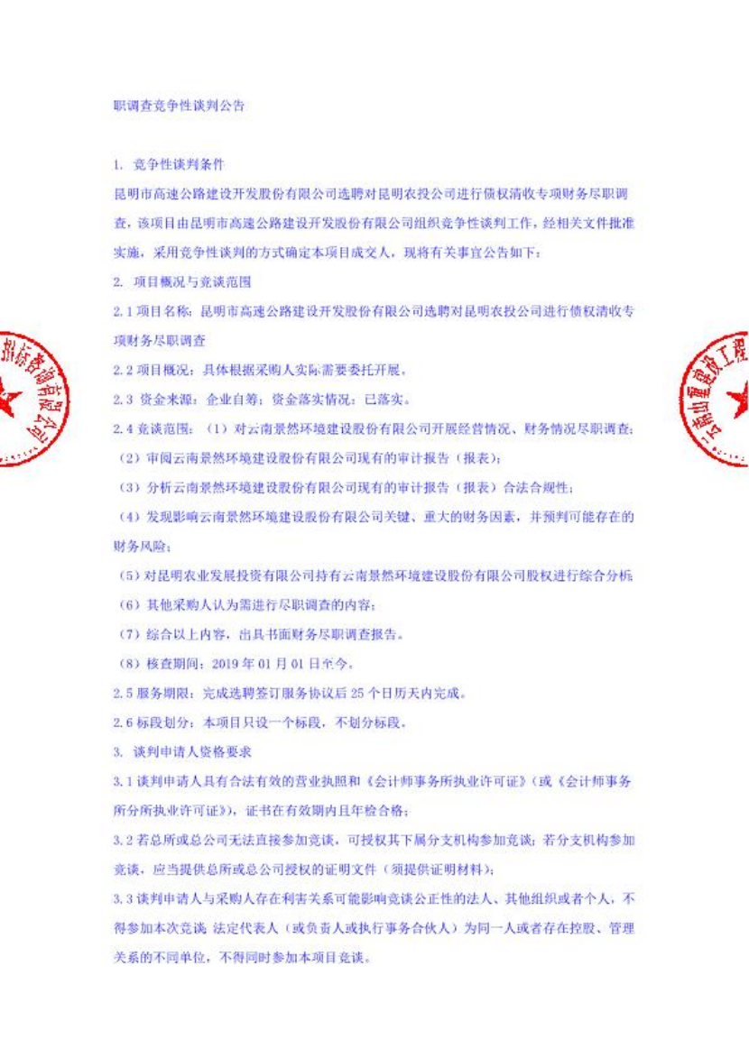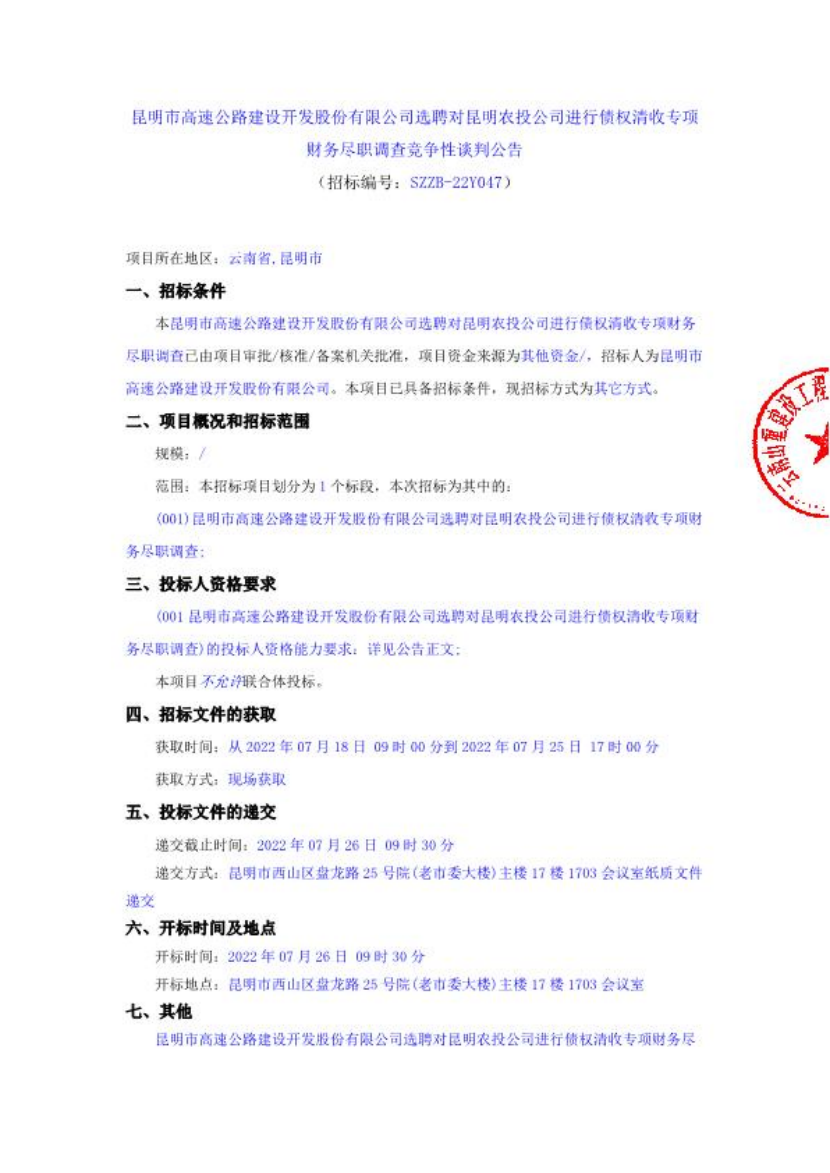 昆明市高速公路建设开发股份有限公司选聘对昆明农投公司进行债权清收专项财务尽职调查竞争性谈判公告