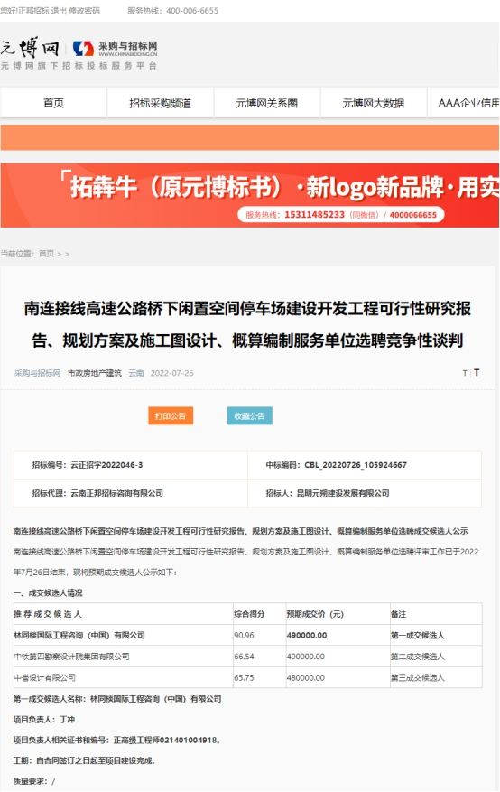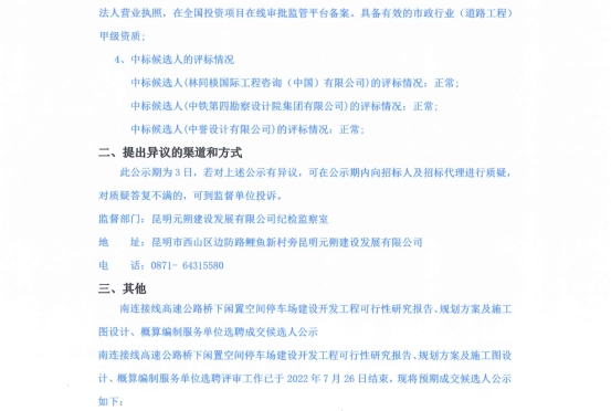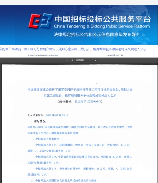南连接线高速公路桥下闲置空间停车场建设开发工程可行性研究报告、规划方案及施工图设计、概算编制服务单位选聘成交候选人公示