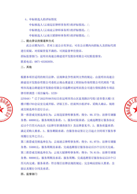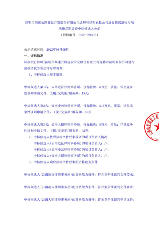 昆明市高速公路建设开发股份有限公司选聘对昆明农投公司进行债权清收专项法律尽职调查中标候选人公示