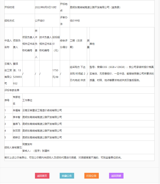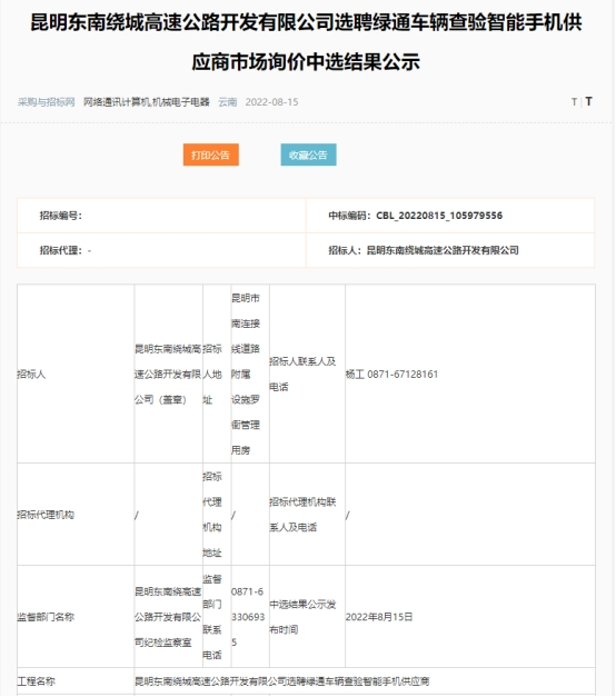 昆明东南绕城高速公路开发有限公司选聘绿通车辆查验智能手机供应商中选结果公示