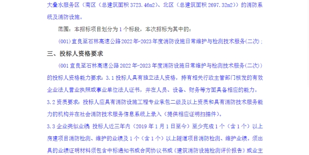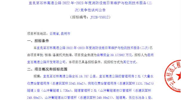 宜良至石林高速公路2022年-2023年度消防设施日常维护与 检测技术服务(二次)竞争性谈判公告