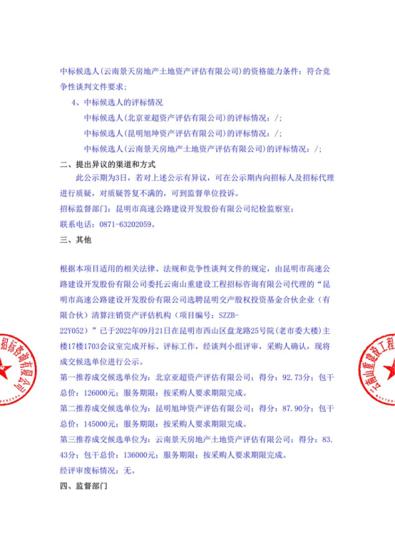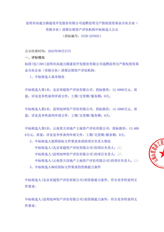 昆明市高速公路建设开发股份有限公司选聘昆明交产股权投资基金合伙企业(有限合伙)清算注销资产评估机构中标候选人公示