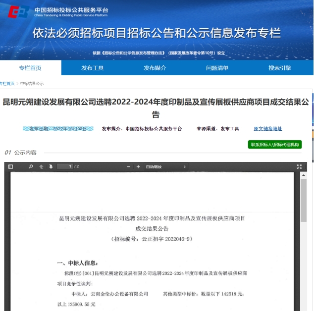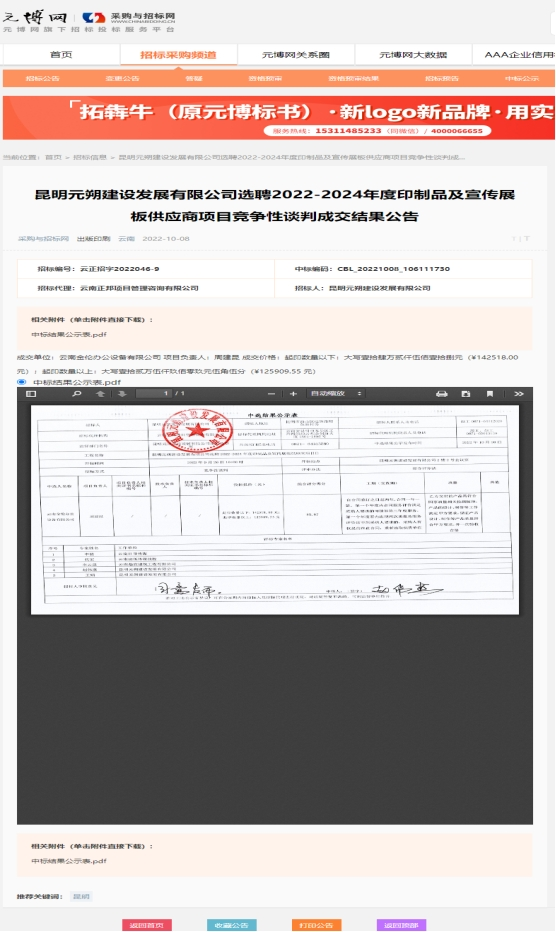 昆明元朔建设发展有限公司选聘2022-2024年度印制品及宣传展板供应商项目成交结果公告