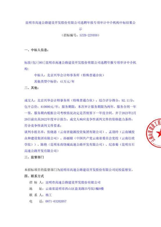 昆明市高速公路建设开发股份有限公司选聘年报专项审计中介机构中标结果公示