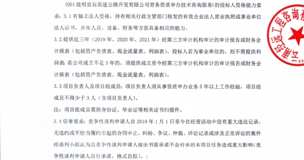 昆明宜石高速公路开发有限公司劳务资质申办技术咨询服务竞争性谈判公告