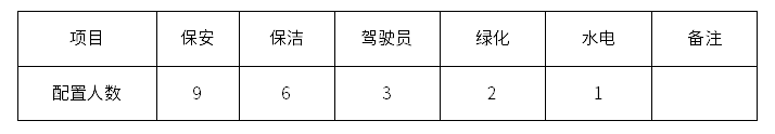 保安人员计划配置9人,其中大叠水管理中心 6人,狗街管理用房3人;驾驶员计划配置3人;保洁人员计划配置6人,其中罗衙办公点1人、大叠水管理中心5人;绿化人员计划配置2人,其中大叠水管理中心1人、狗街管理用房1人;水电工计划配置1人;以上人员具体工种及人数均以甲方实际要求为准,部分工种可根据实际提供倒班宿舍,在宜石公司食堂用餐需付费,餐费标准参照宜石公司的相关标准执行。